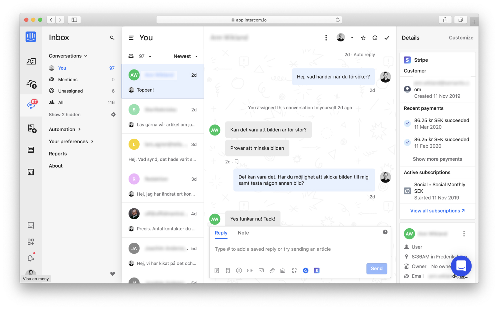 We mainly use Intercom as a support tool. All incoming support emails as well as the chat both on the external site and for logged in users end up in Intercom. We have also linked our payment system Stripe to see data about paying customers there.
